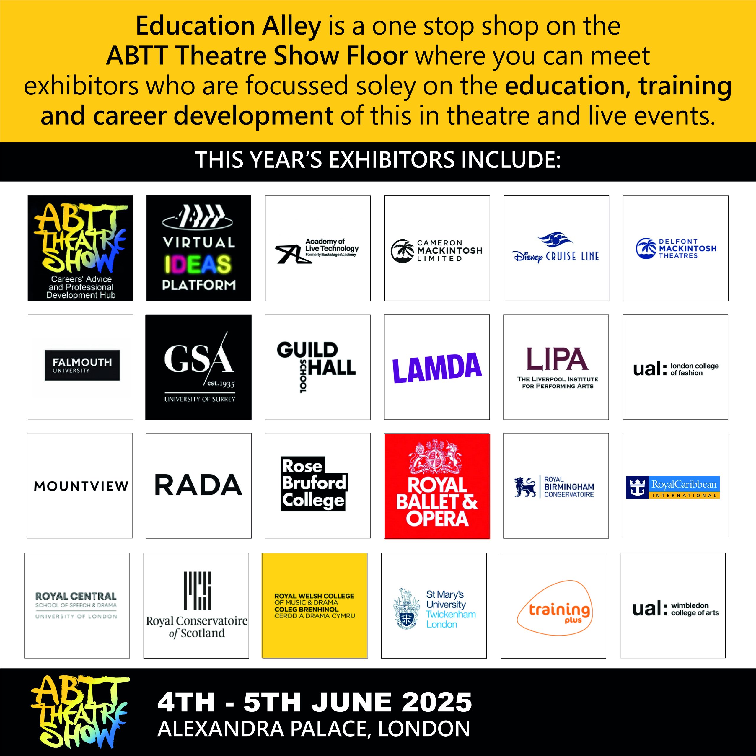 The ABTT Education Alley and the Careers and Professional Development Hub – have been devised to assist you in your career in the Theatre industry, providing opportunities for you to speak with professionals about pathways into and through the Industry and opportunities to find out about relevant training, apprenticeships, courses and more so you can wrap your head around the best next steps for you! We cannot wait to see you all at the ABTT Theatre Show and look forward to bringing a wide-range of seminars and discussions on a variety of topics currently of interest to the Industry.