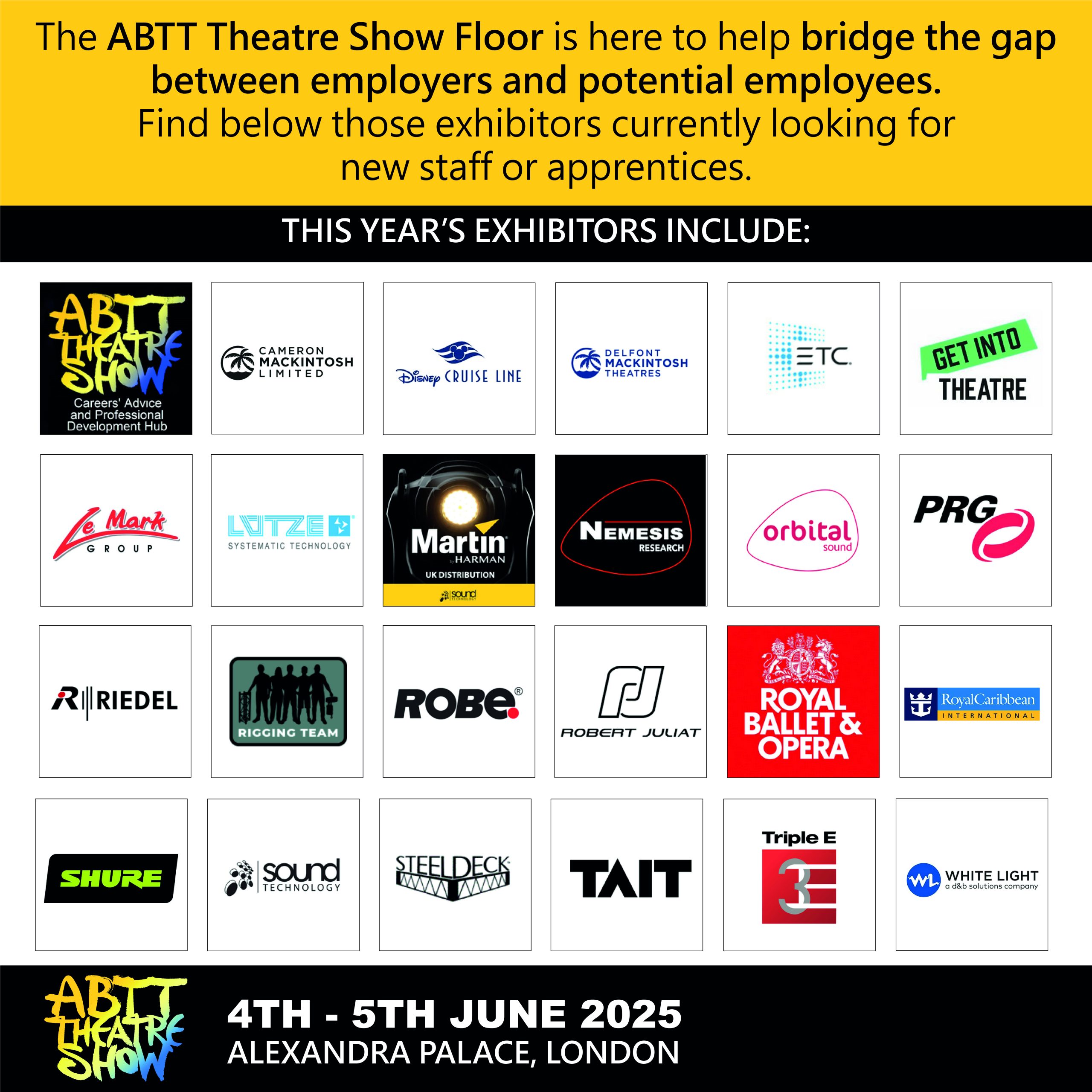 Please find links below to Exhibitors who will be actively recruiting during the Theatre Show. It may also be worth popping by the ABTT Careers and Professional Development Hub which has been devised to assist you in your career in the Theatre industry. It provides opportunities for you to speak with professionals about pathways into and through the Industry, to find out about relevant training, apprenticeships, courses, employment and more so you can wrap your head around the best next steps for you!